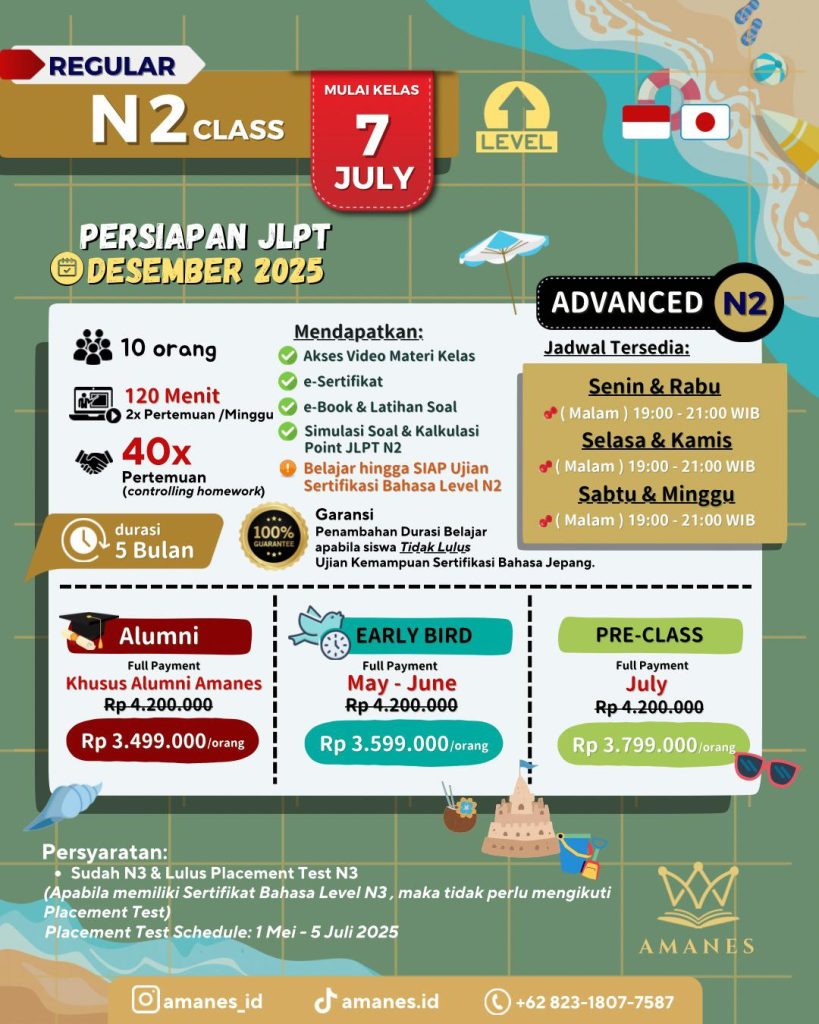 *Garansi Penambahan Durasi & Konsultasi belajar apabila siswa tidak lulus Test Kemampuan Sertifikasi Bahasa Jepang.